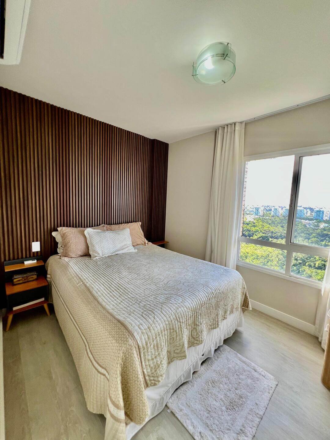 Localizado em andar alto, com posição norte/sul e vista livre para o bosque, o apartamento oferece ventilação cruzada, iluminação natural e uma vista agradável e definitiva.
