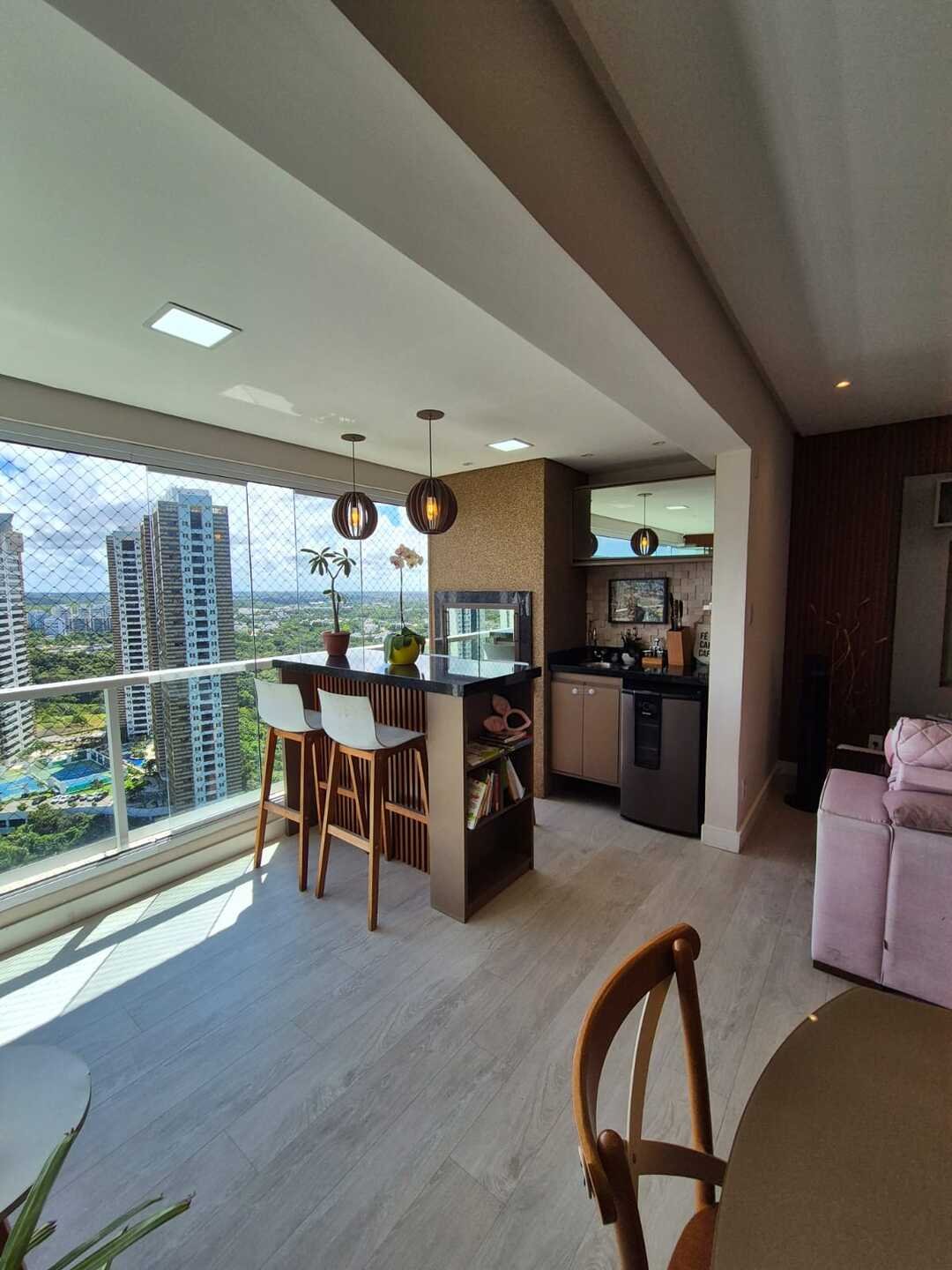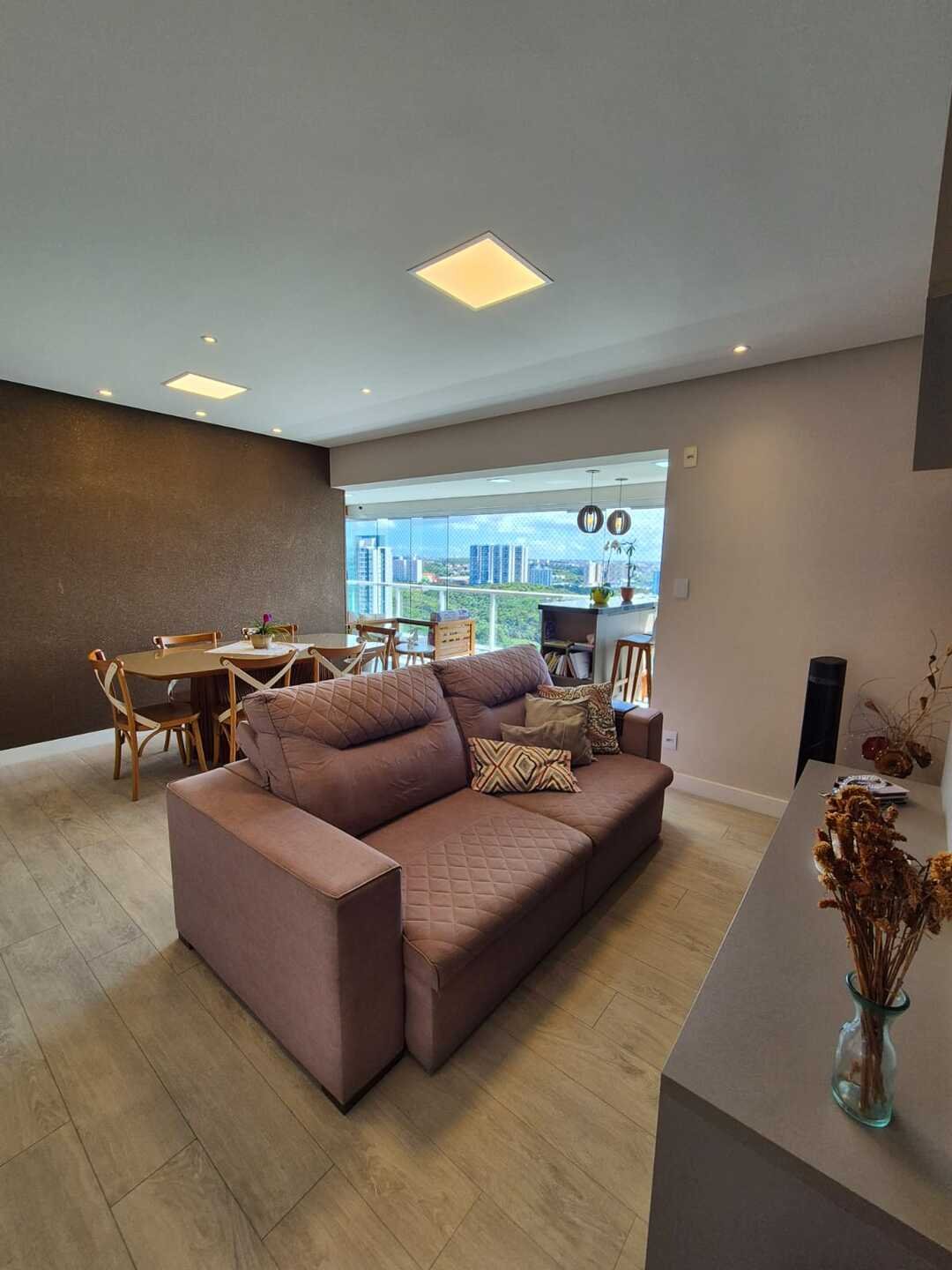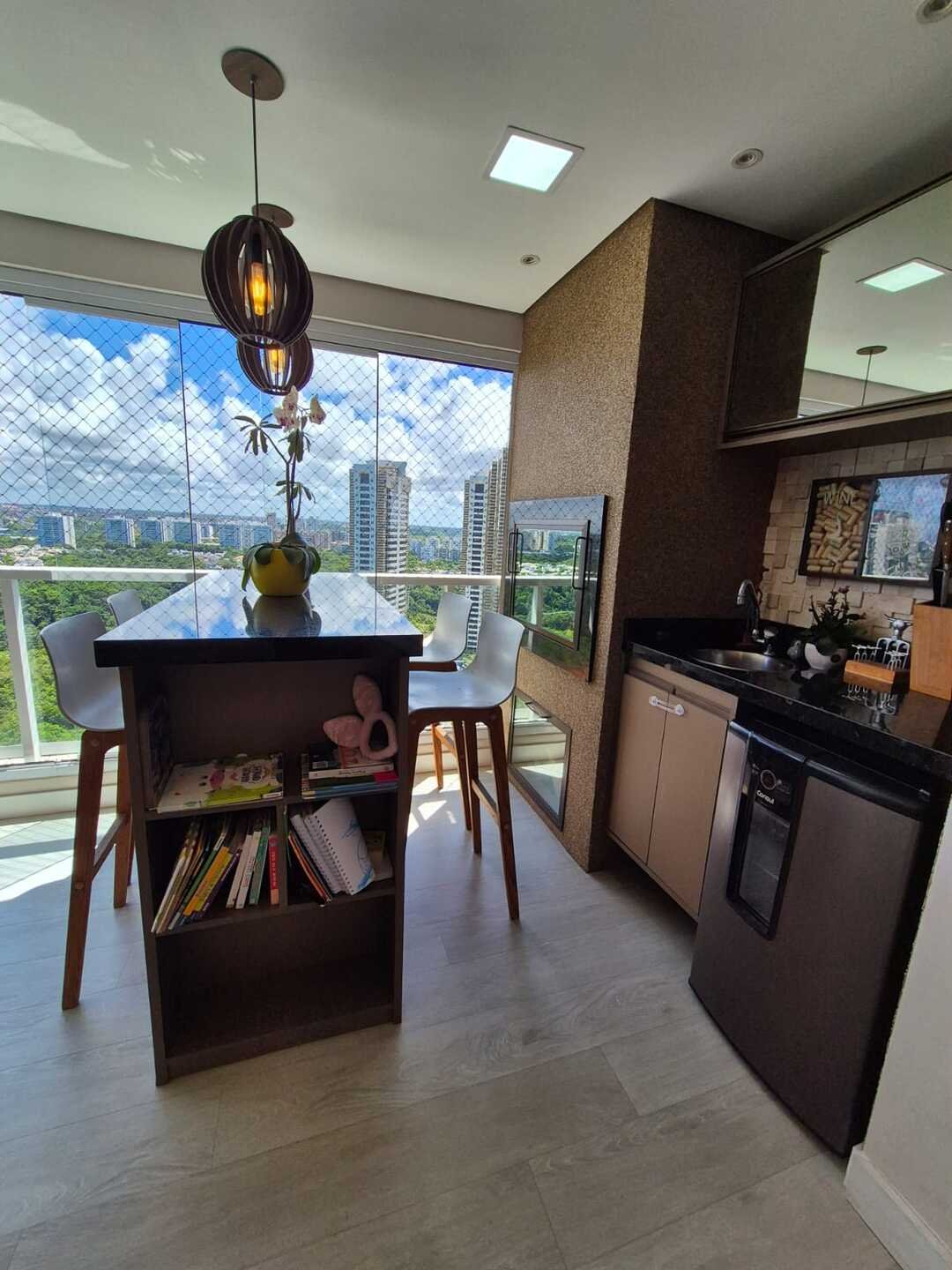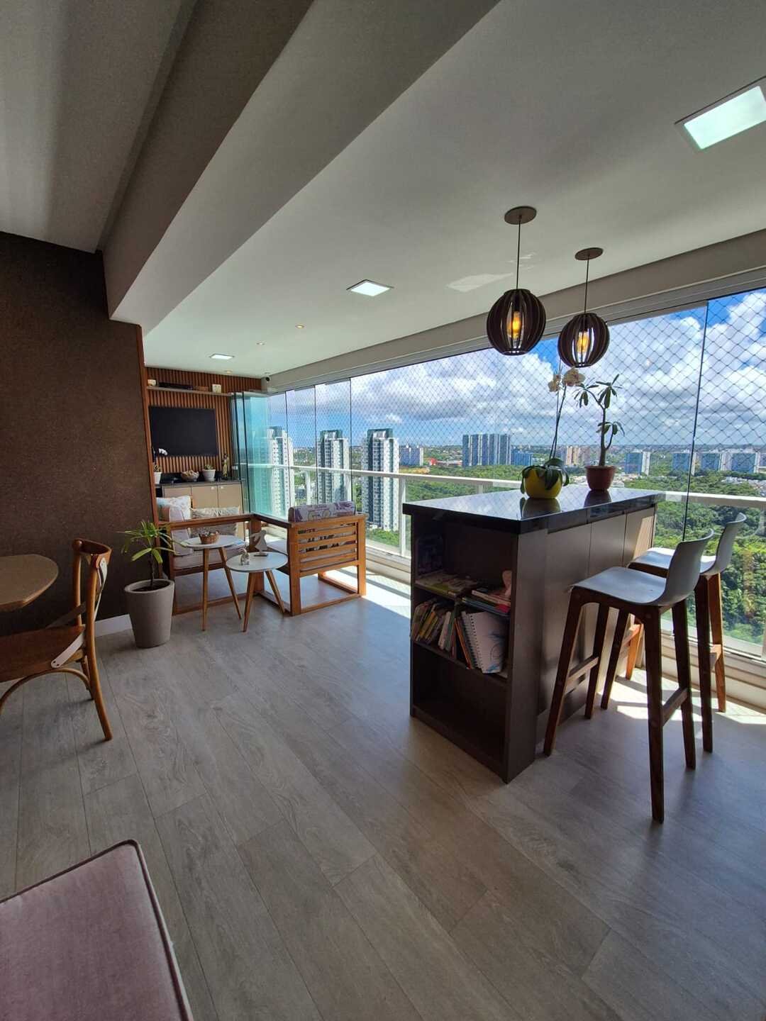 Com 110 m² de área privativa, o imóvel foi reformado e decorado, contando com um projeto contemporâneo que valoriza a integração dos ambientes e o conforto no dia a dia. A sala integrada à varanda gourmet, com fechamento em Reiki e churrasqueira a carvão, cria um espaço ideal para receber amigos e familiares.