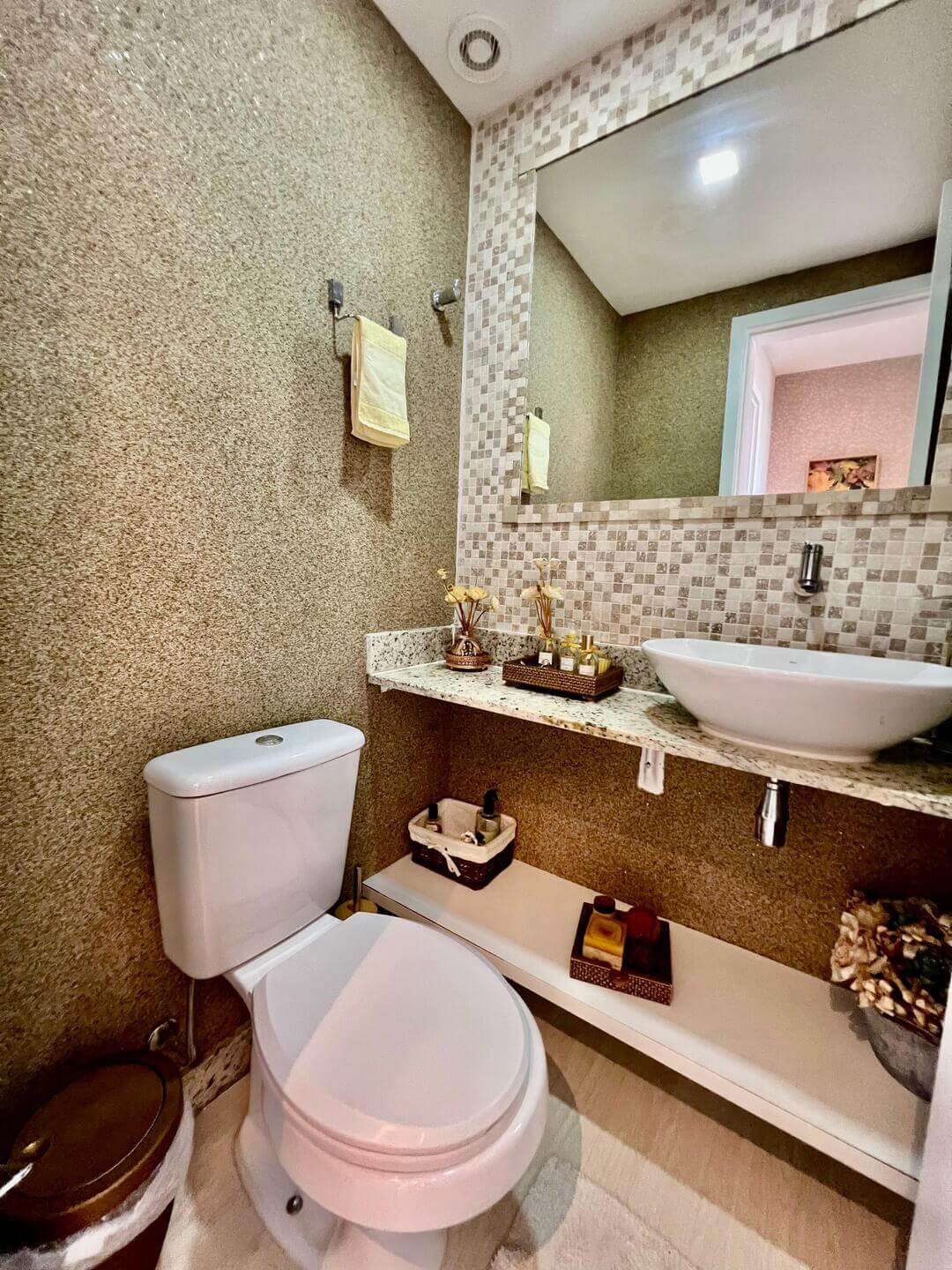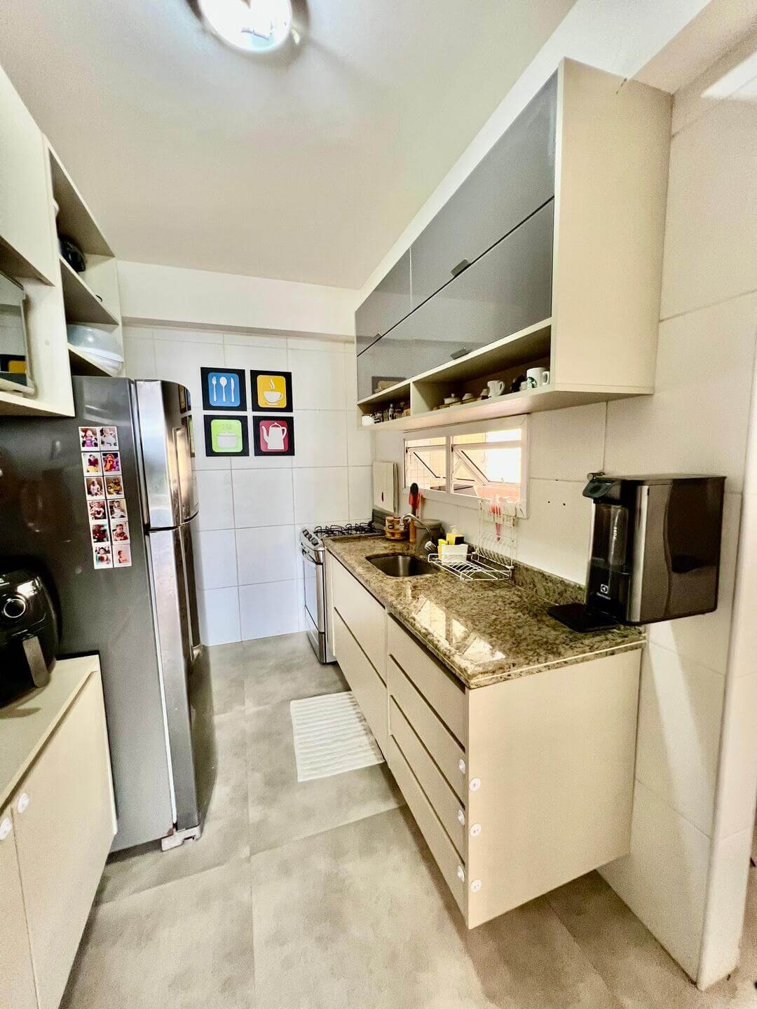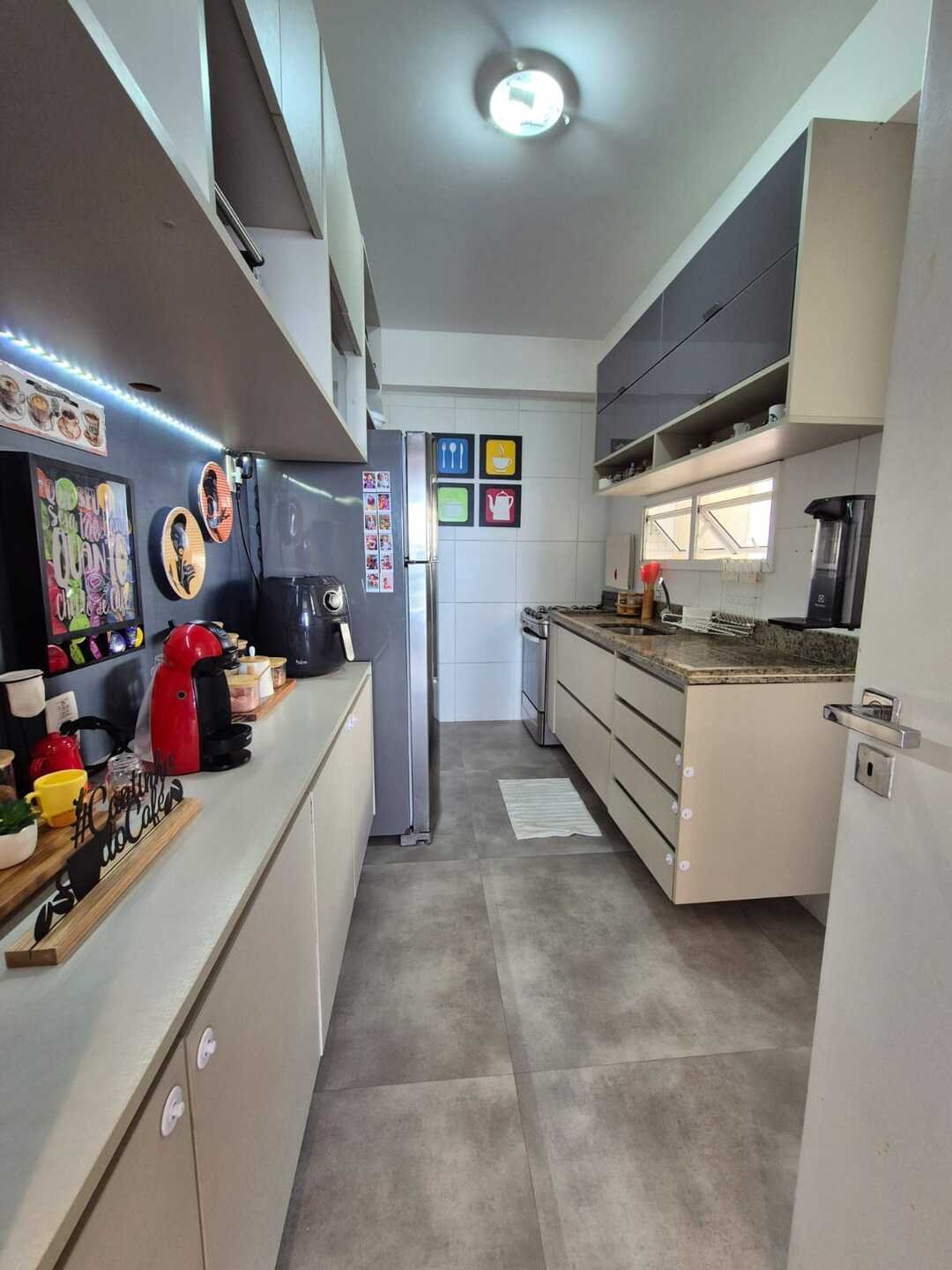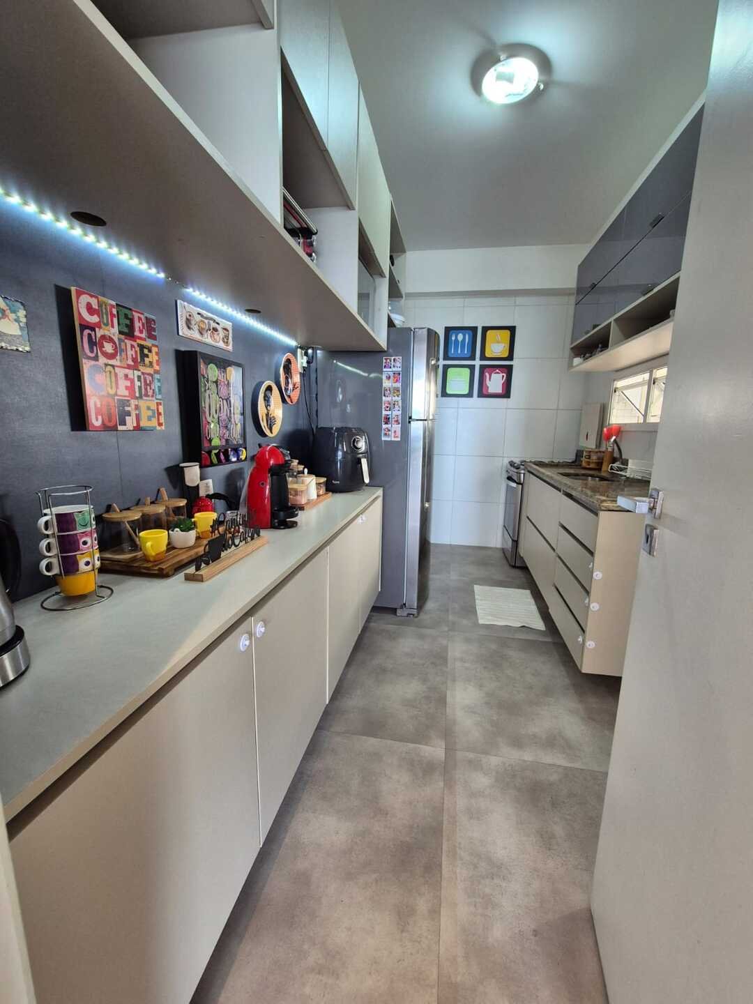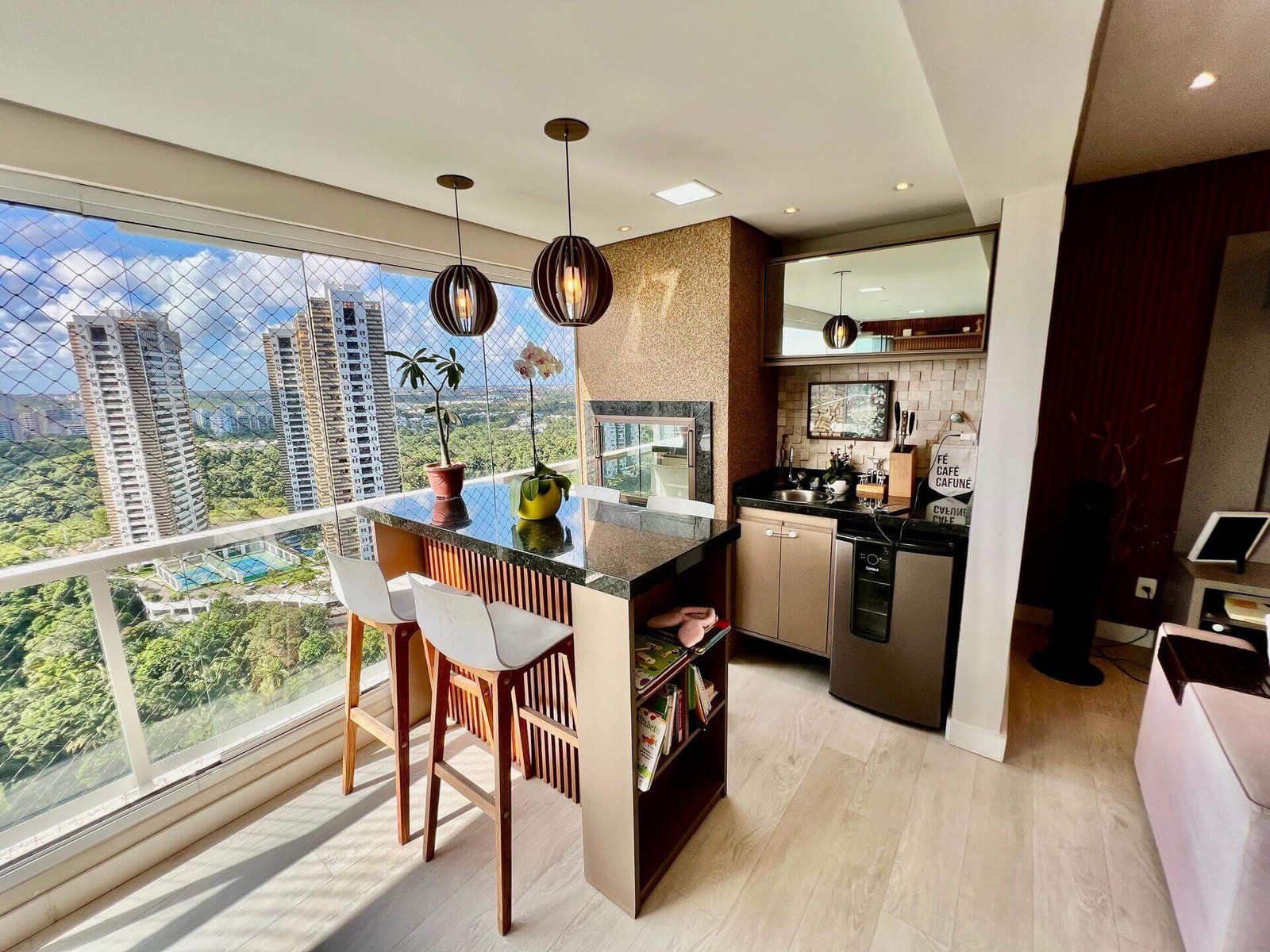 Com 110 m² de área privativa, o imóvel foi reformado e decorado, contando com um projeto contemporâneo que valoriza a integração dos ambientes e o conforto no dia a dia. A sala integrada à varanda gourmet, com fechamento em Reiki e churrasqueira a carvão, cria um espaço ideal para receber amigos e familiares.