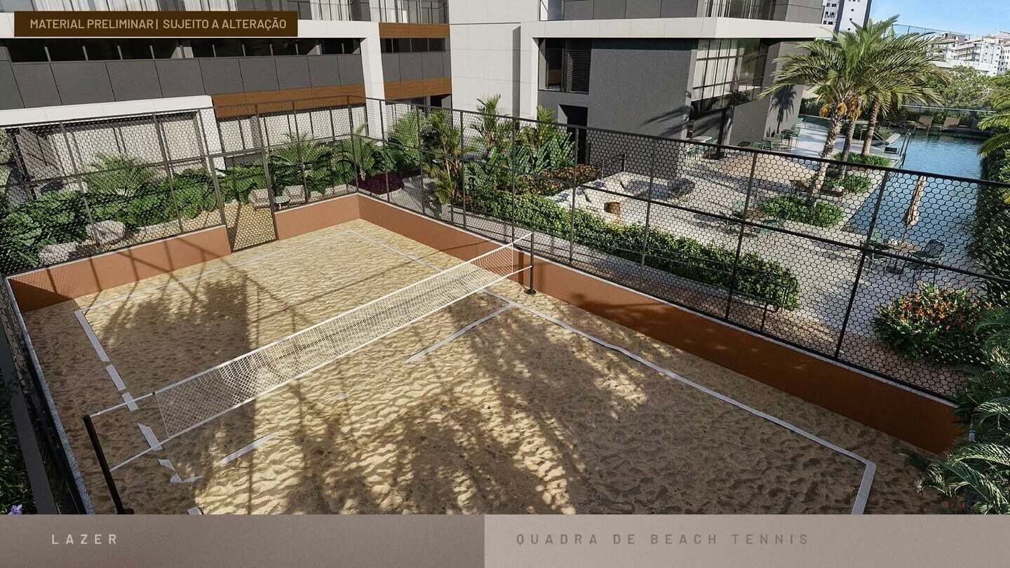 Piscina adulto com raia de 25 m e piscina infantil, prainha, deck e solário, espaço gourmet integrado à piscina, quadra de beach tennis com lounge, alameda interna com paisagismo biofílico, áreas de convivência e descanso, além de espaços voltados à gastronomia e entretenimento.