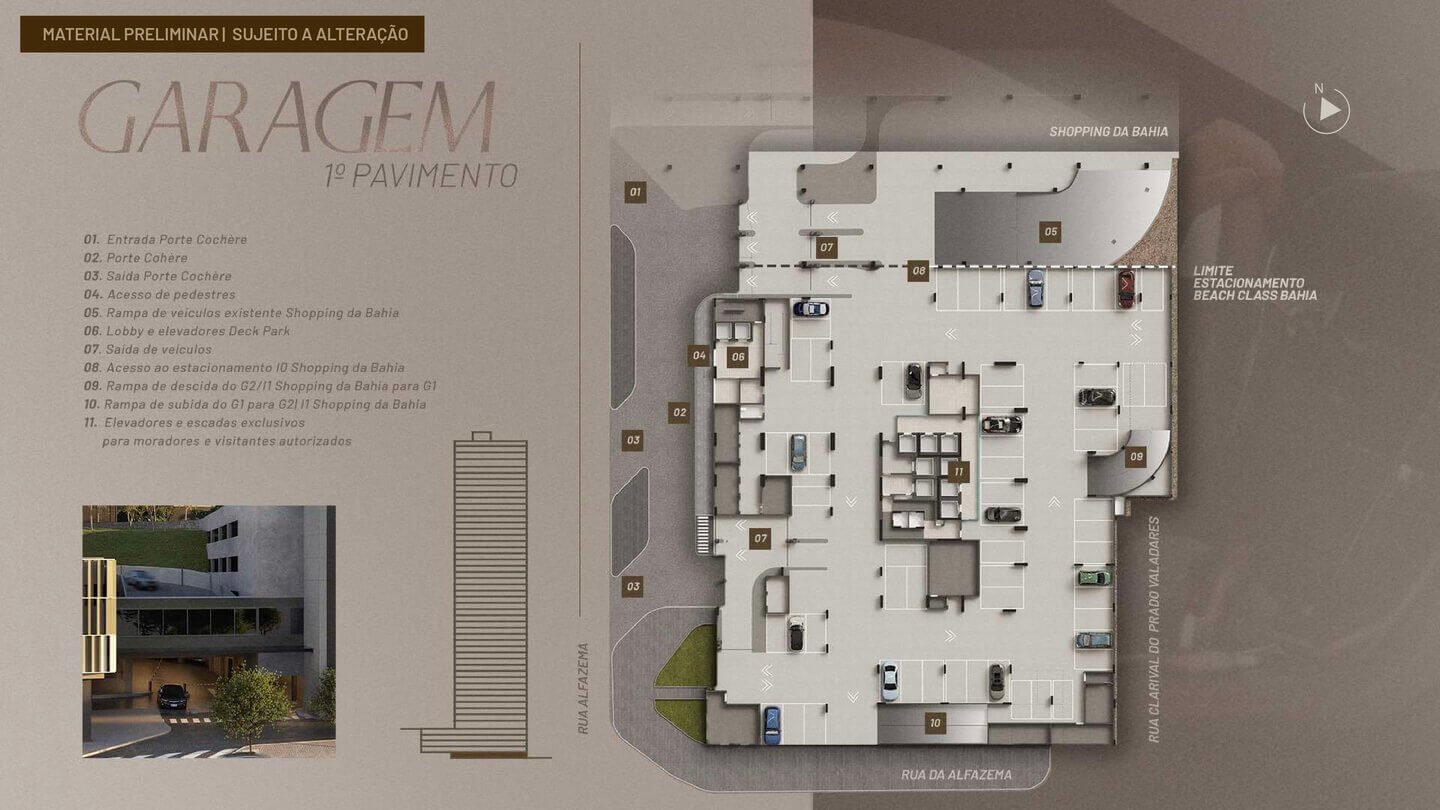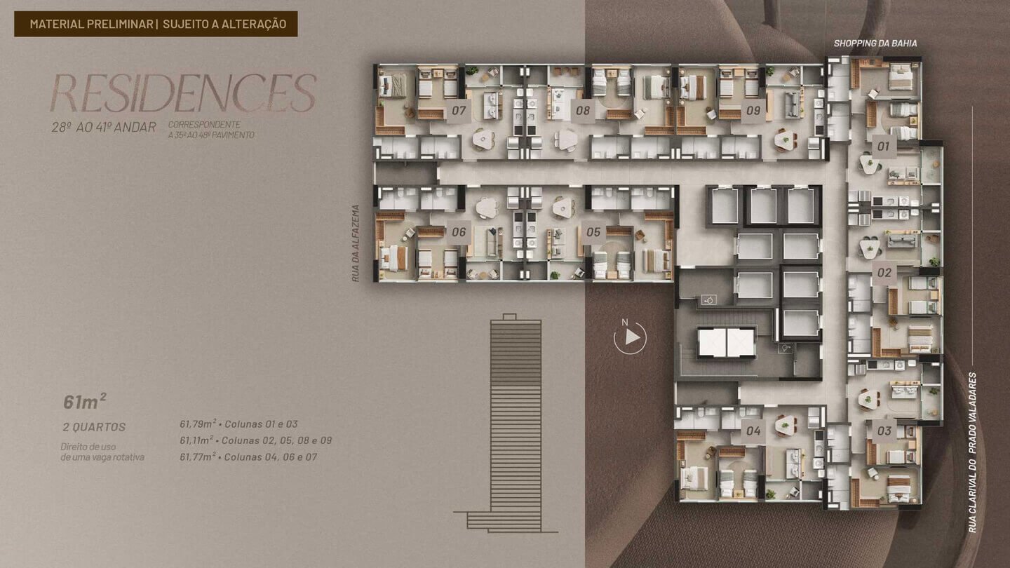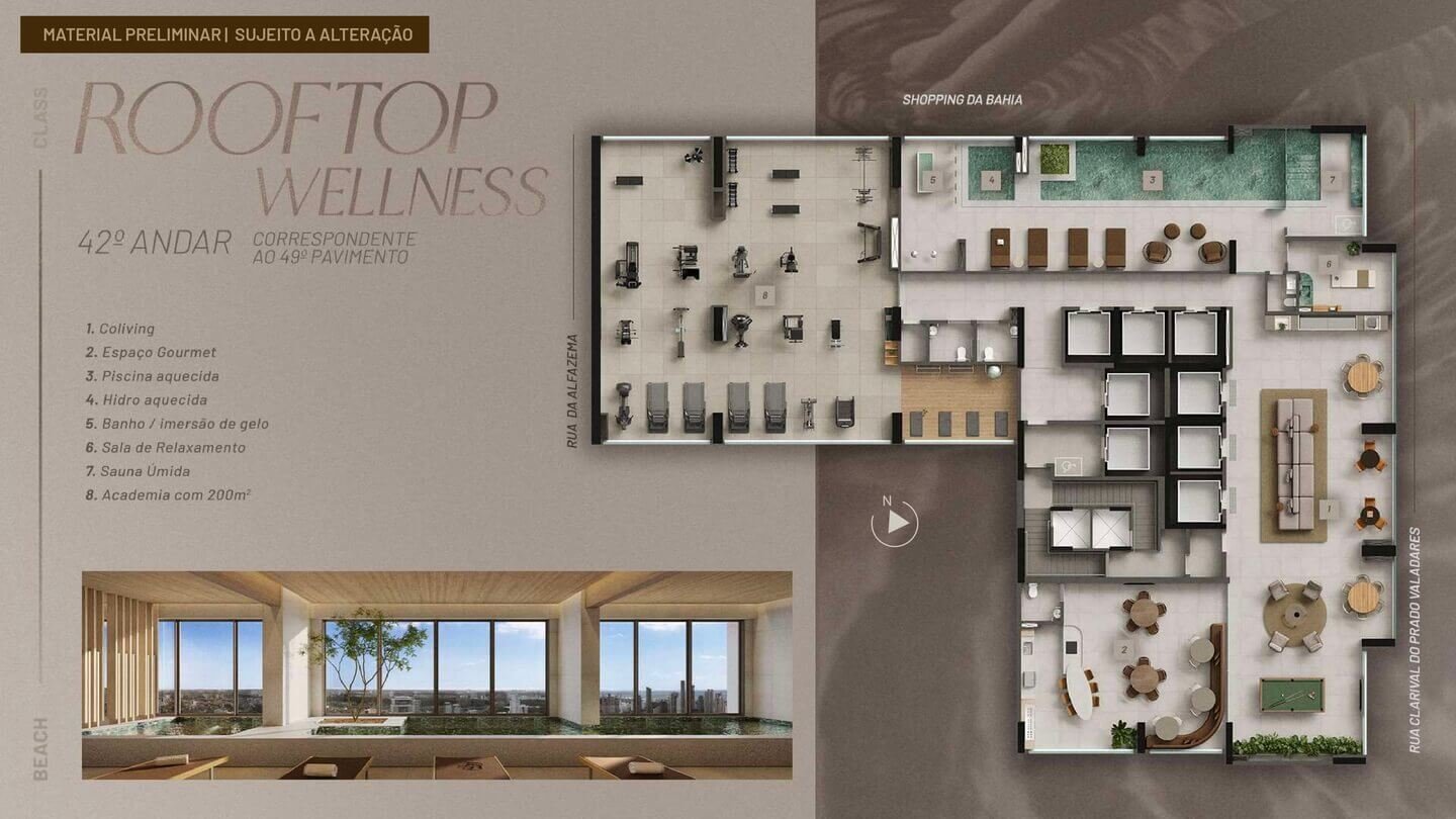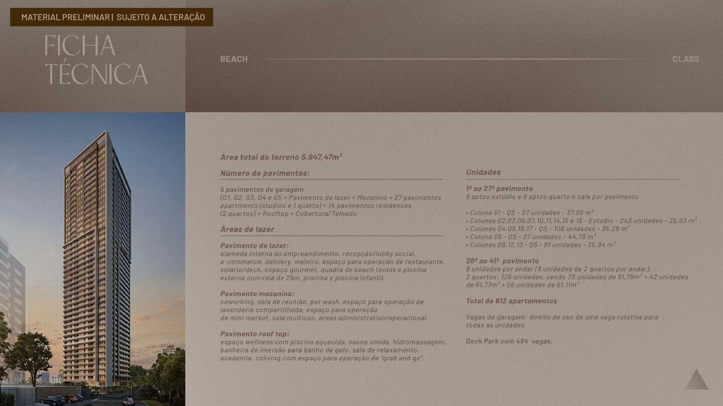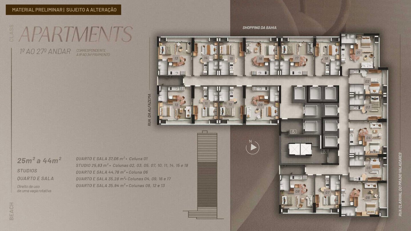 O Beach Class Bahia será implantado em um terreno com área total de 5.842,47 m², com uma torre de uso misto composta por: