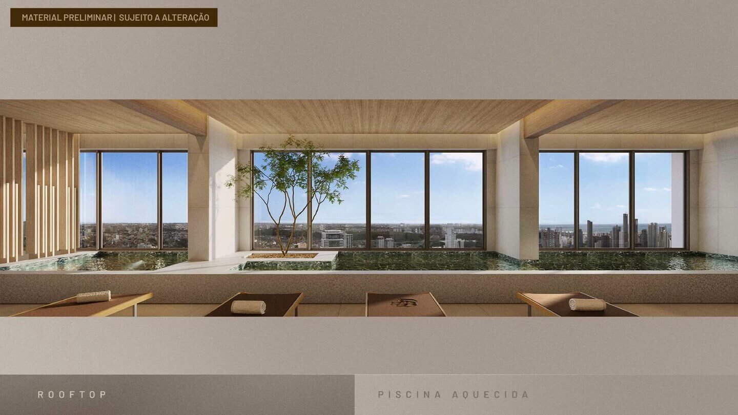 No topo do edifício, o rooftop oferece uma experiência exclusiva de bem-estar e contemplação da cidade, com ambientes voltados ao cuidado do corpo e da mente.