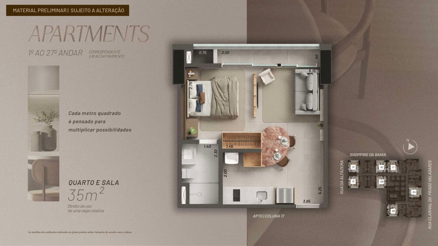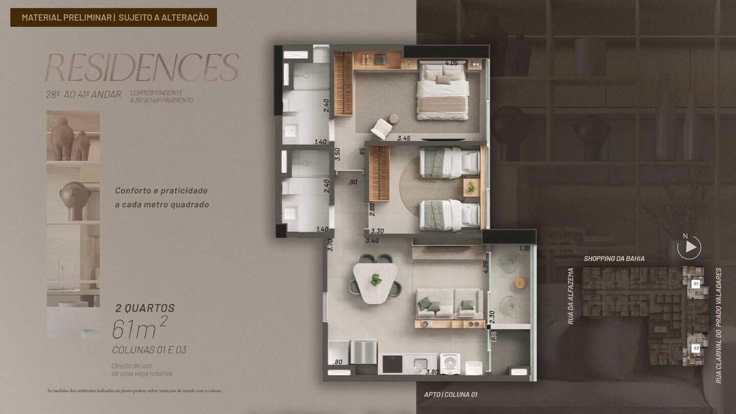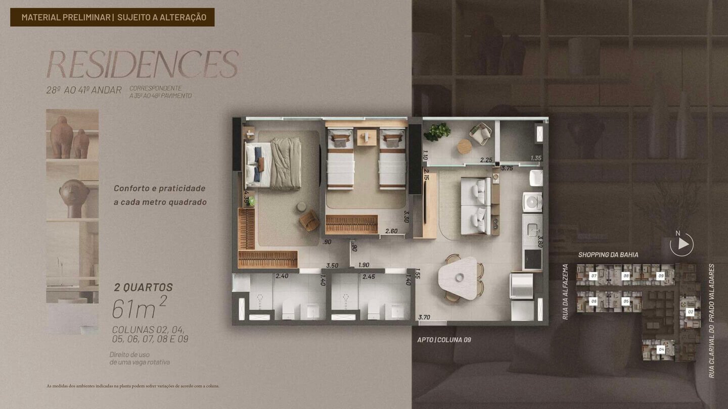 As metragens podem variar conforme a coluna, conforme indicado no material técnico do empreendimento.