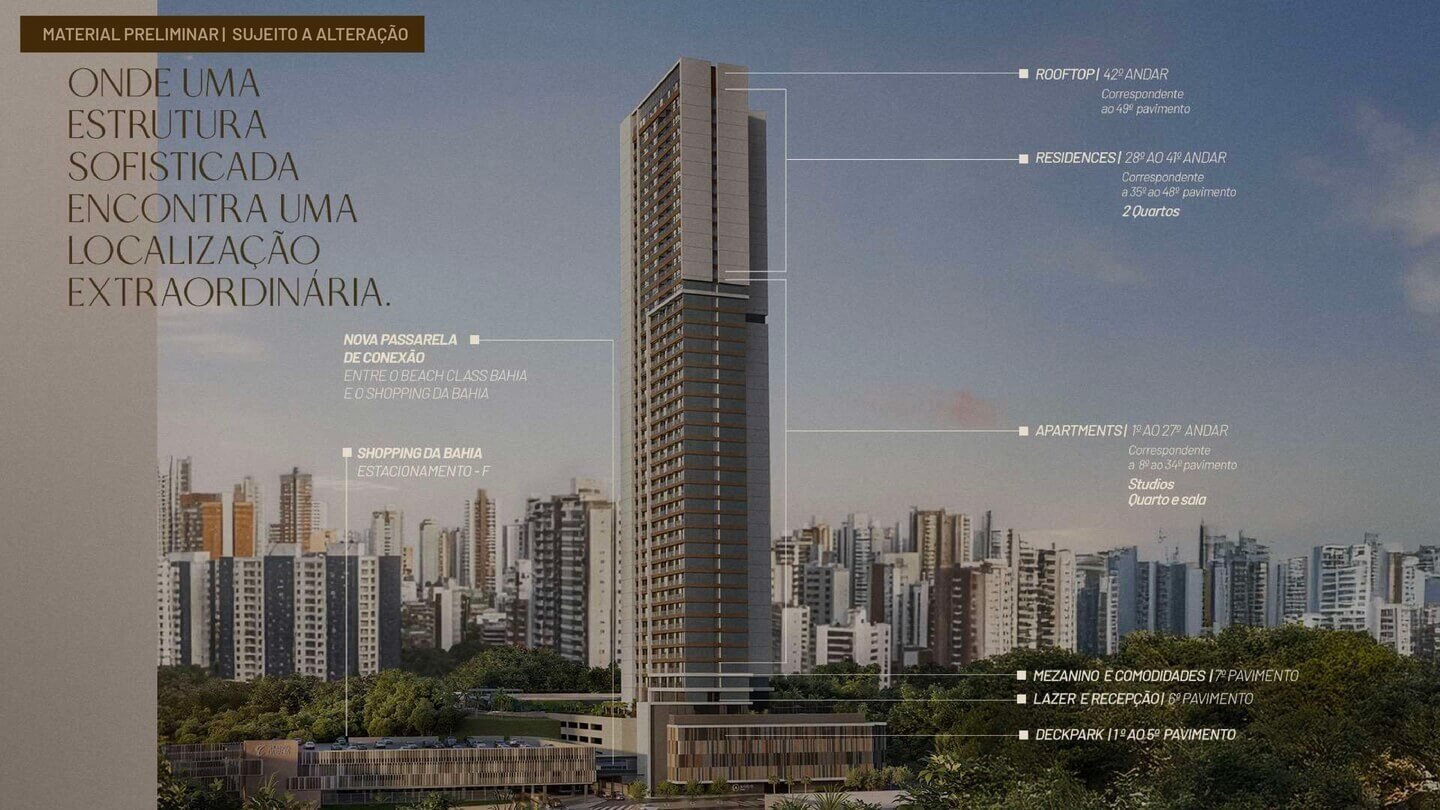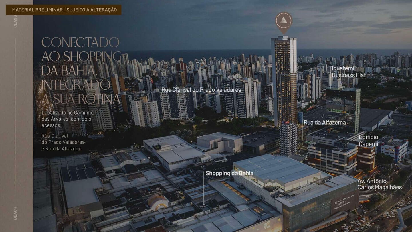 O Beach Class Bahia nasce como um projeto pioneiro em Salvador, reunindo inovação, conveniência e rentabilidade em um conceito urbano inédito. Trata-se do primeiro empreendimento residencial do Nordeste integrado a um shopping center, com conexão direta ao Shopping da Bahia por passarela exclusiva, oferecendo uma nova forma de viver, investir e se conectar à cidade.
