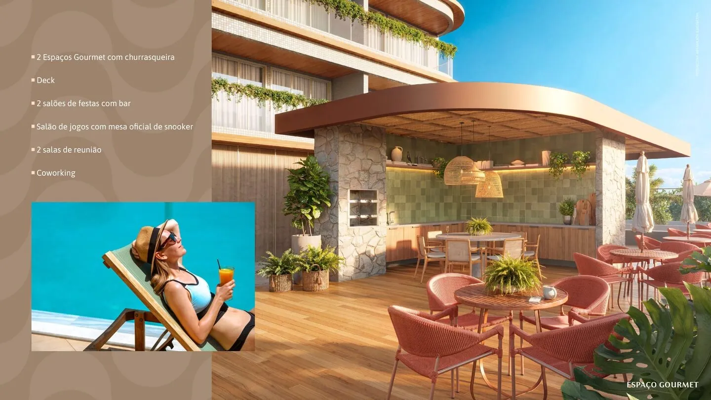 Os espaços de lazer foram inspirados no estilo de vida praiano, com ambientes funcionais, bem decorados e criados para atender diferentes perfis de moradores.