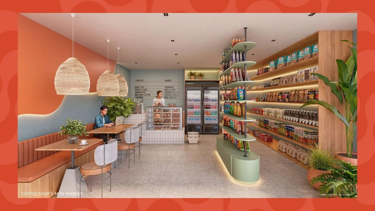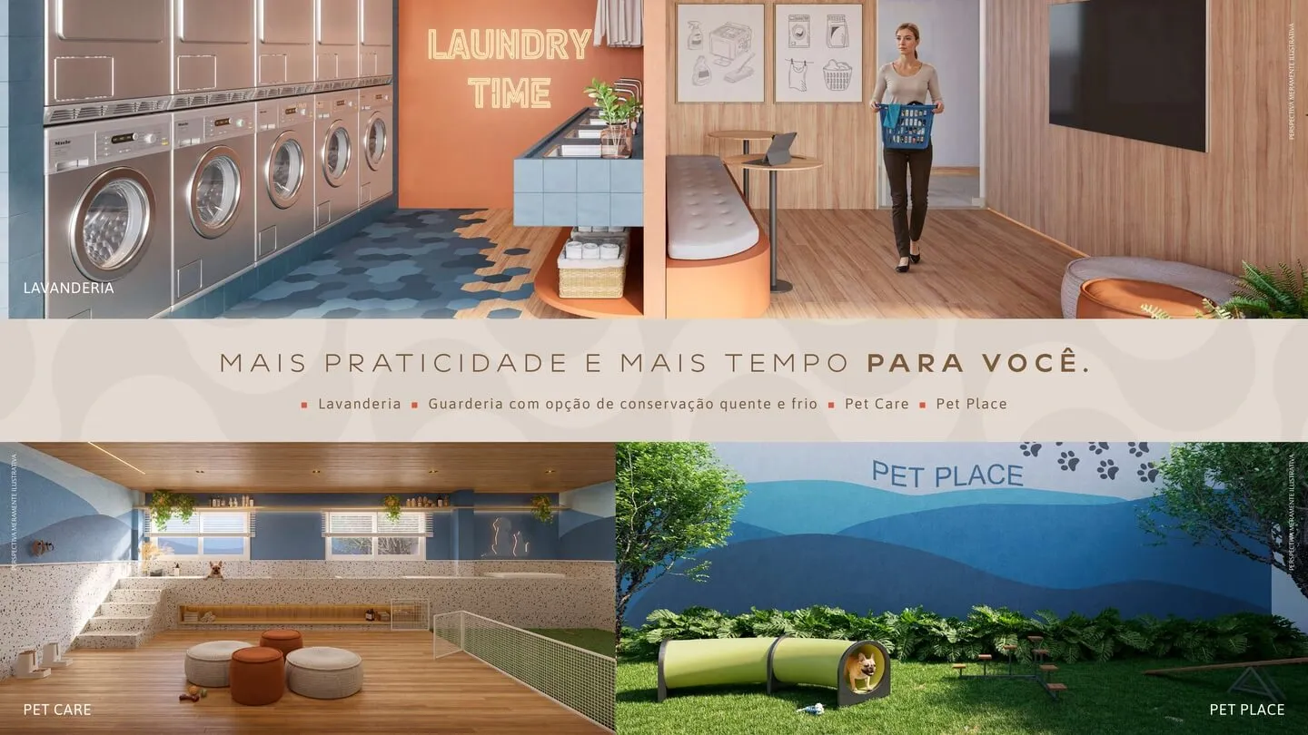 O conceito Smart é reforçado por soluções práticas que simplificam o cotidiano, como lavanderia compartilhada, espaços corporativos para home office, serviços para pets, área de pranchas, mercado interno e infraestrutura para mobilidade elétrica.