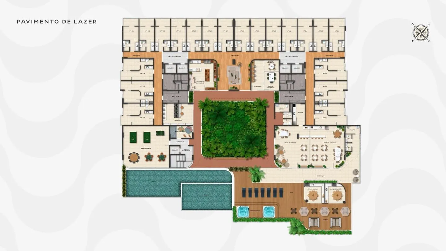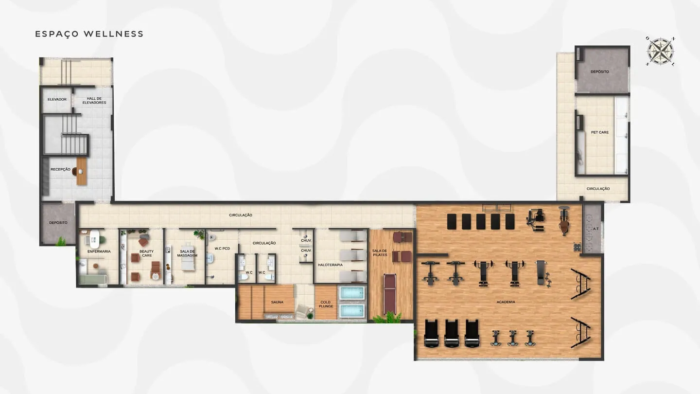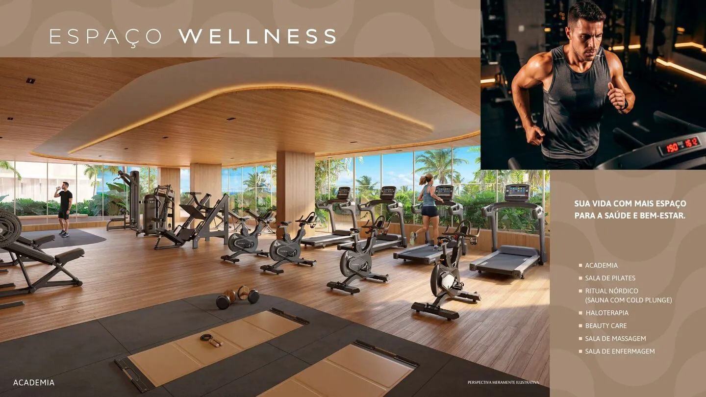 Piscinas com deck | Piscinas de hidromassagem aquecida | Espaços Gourmet | 2 Salões de festas integráveis | Coffee Shop/Mini Market | Salão de jogos | Espaço Kids | 2 Salas de reunião | Coworking | Lavanderia | Jardim tropical | Academia | Sala de Pilates | Ritual Nórdico (sauna + cold plunge) | Haloterapia | Beauty Care | Sala de massagem | Sala de enfermagem | Pet Care | Pet Place | Guarderia com conservação quente e fria | Bicicletário | Prancharia | 2 Postos de Car Wash | 7 Postos para carros elétricos