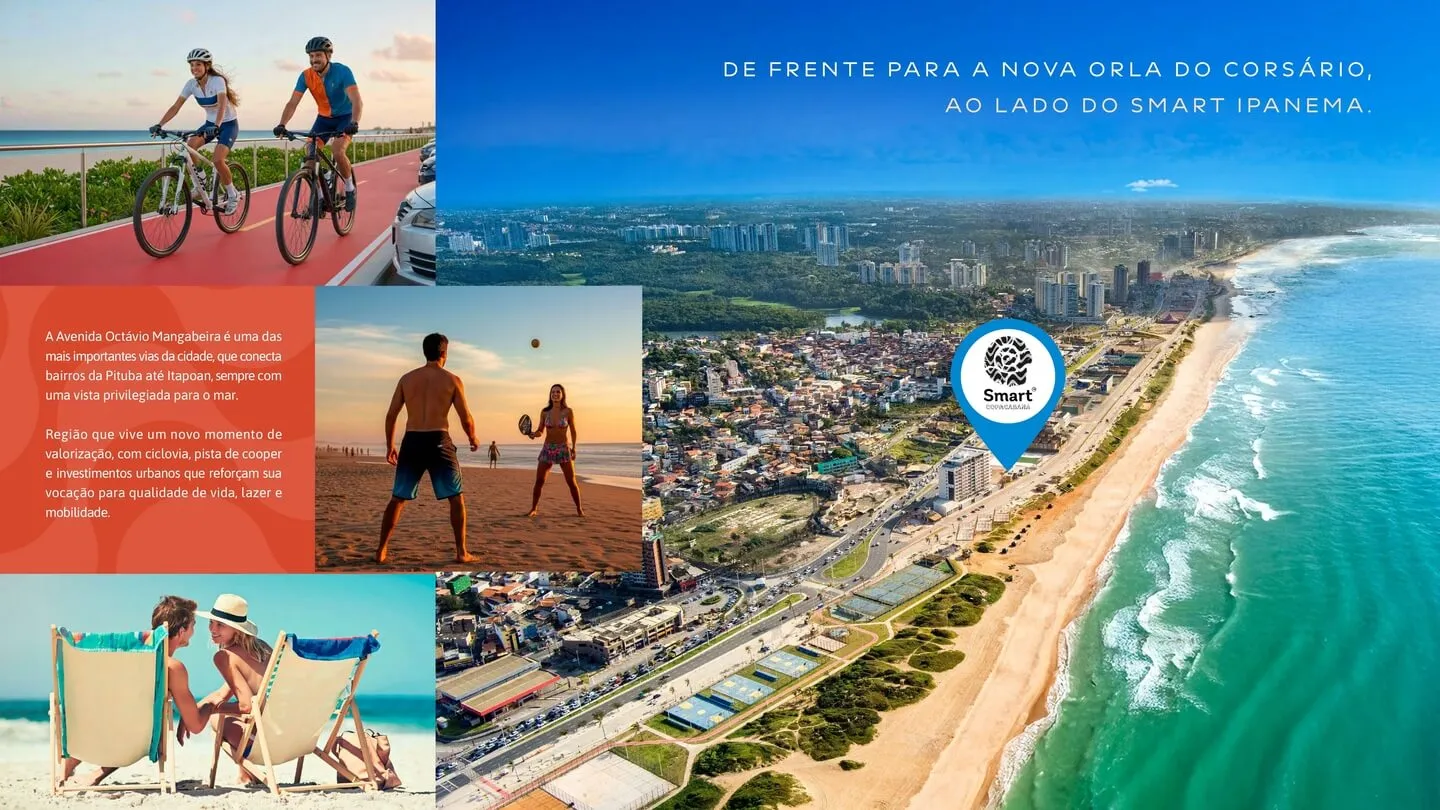 Situado na Av. Octávio Mangabeira, uma das avenidas mais valorizadas e emblemáticas de Salvador, o Smart Copacabana está inserido em uma região em pleno processo de transformação urbana. A nova Orla do Corsário traz ciclovia interligada, pista de cooper, novos equipamentos urbanos, áreas de convivência, gastronomia e vistas abertas para o oceano.