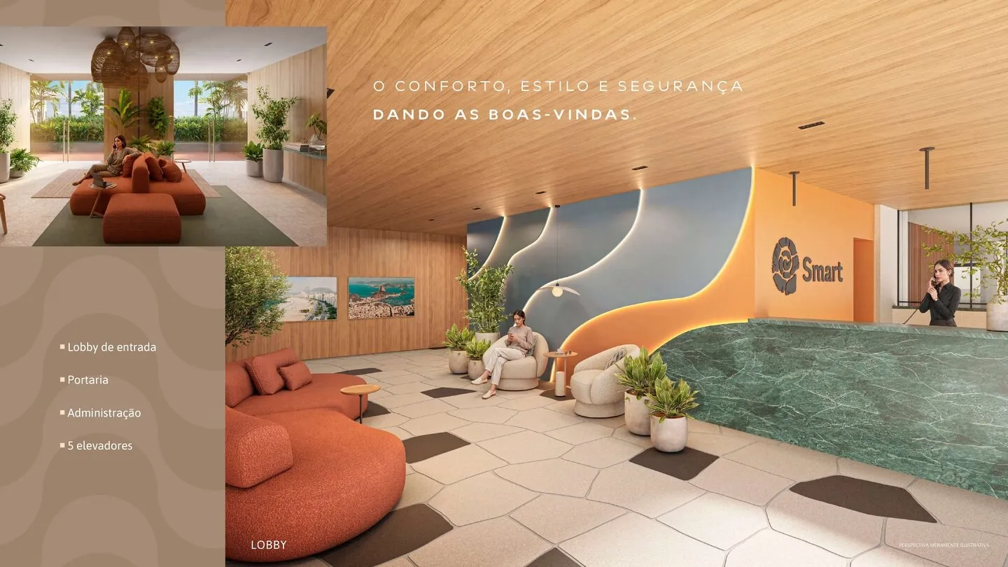 O Smart Copacabana apresenta um conjunto completo de facilidades, lazer, bem-estar e conveniência distribuídos em diferentes pavimentos, sempre valorizando a integração entre áreas internas e externas. O lobby de entrada recebe o morador com projeto moderno e serviços essenciais, como portaria, administração e 5 elevadores.