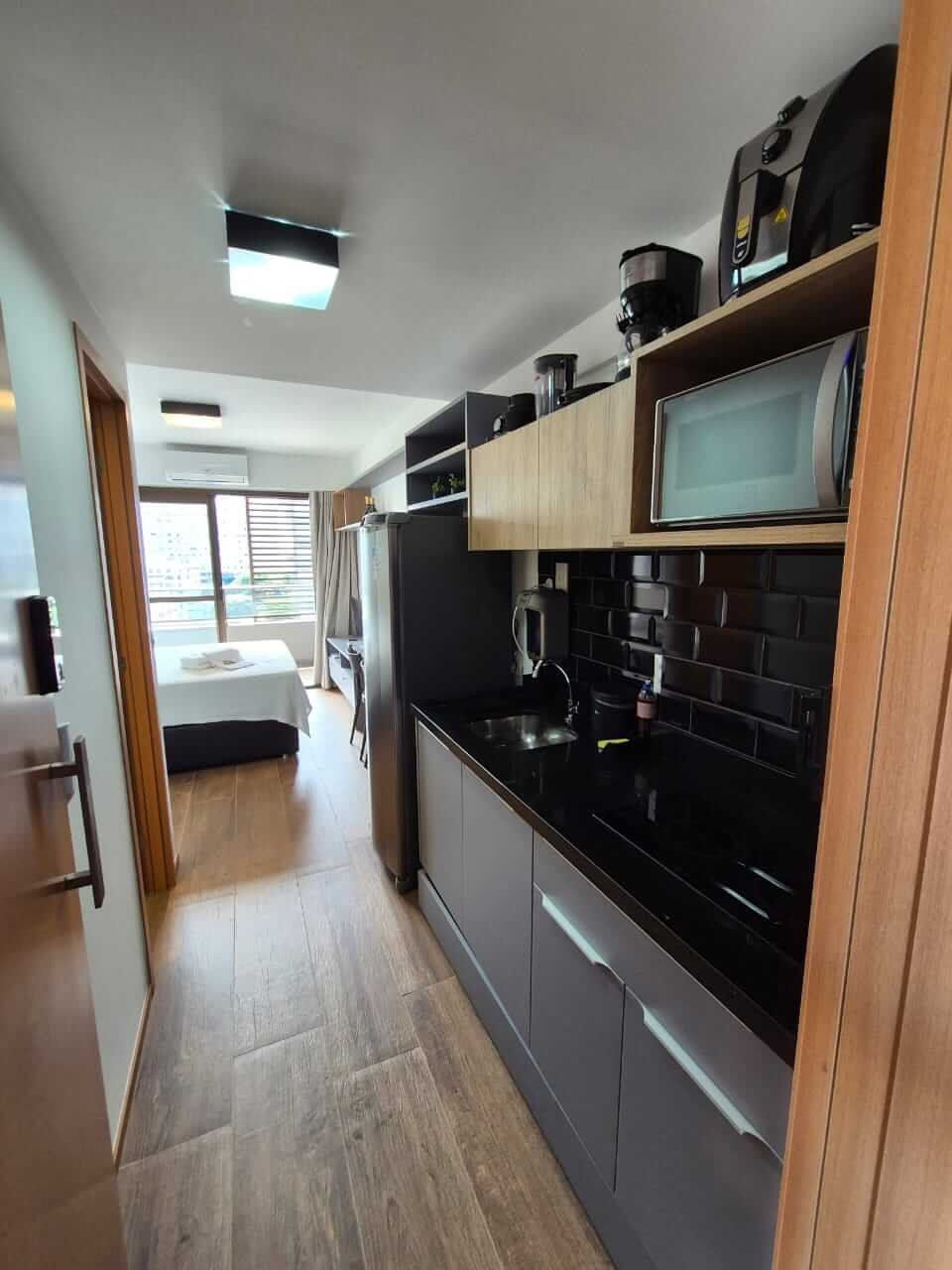 Com 24,25 m² de área privativa, o apartamento está situado em andar alto e conta com varanda, proporcionando mais ventilação e luminosidade. O imóvel será vendido no formato porteira fechada, totalmente mobiliado, decorado e equipado, ideal para quem deseja praticidade imediata.
